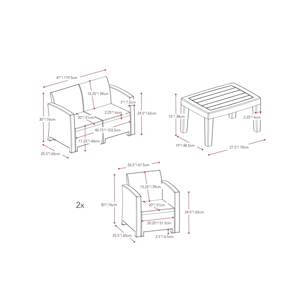 • Set includes loveseat, coffee table, 2 chairs and seat cushions